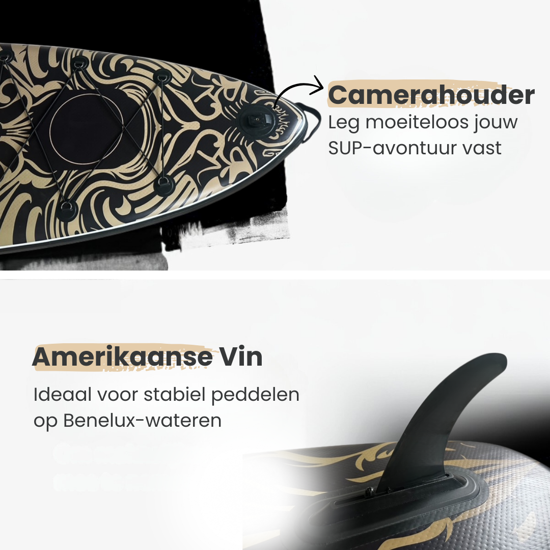 - Verpakkingsinhoud: 1x SUP board, 1x handleiding, 1x dubbelwerkende pomp, 1x peddel, 1x backpack, 1x enkelkoord, 1x waterdicht telefoonhoesje, 1x afneembare Amerikaanse vin, 1x reparatiekit.
